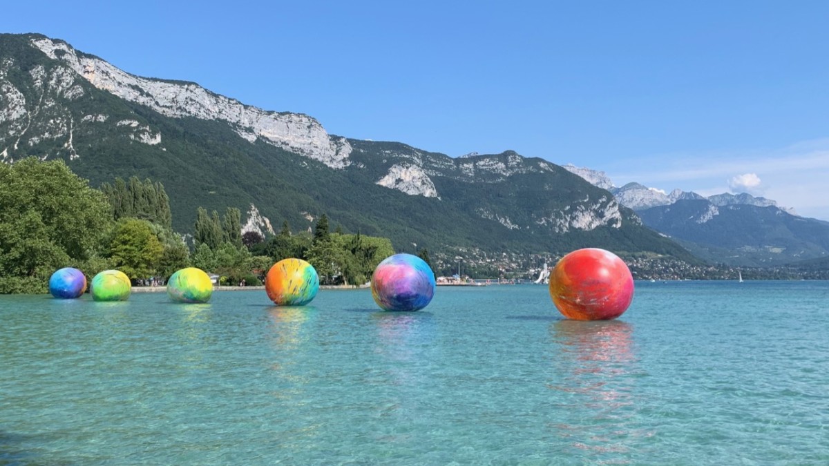 Vlak voor Annecy wordt het tijd om af te koelen. We zetten de fietsen langs het meer, hup in de zwemkledij en Au ! Geen zandstrandjes hier maar keien. Voorzichtig het water in dus. Vooraf hebben we vanzelfsprekend eerst wat literatuuronderzoek gedaan. Het meer is 38 kilometer in omtrek en gemiddeld 41,5 meter diep. Een zwemdiploma is dus wel handig! De verversingstijd van het meer is vier jaar dus het stroomt hier niet echt. Als je je laat drijven op een luchtbedje duurt het dus eventjes voor je in Annecy bent. In juli heeft het meer een aangename temperatuur van 22’C. Nou dat klinkt allemaal okay dus tijd voor een duik.