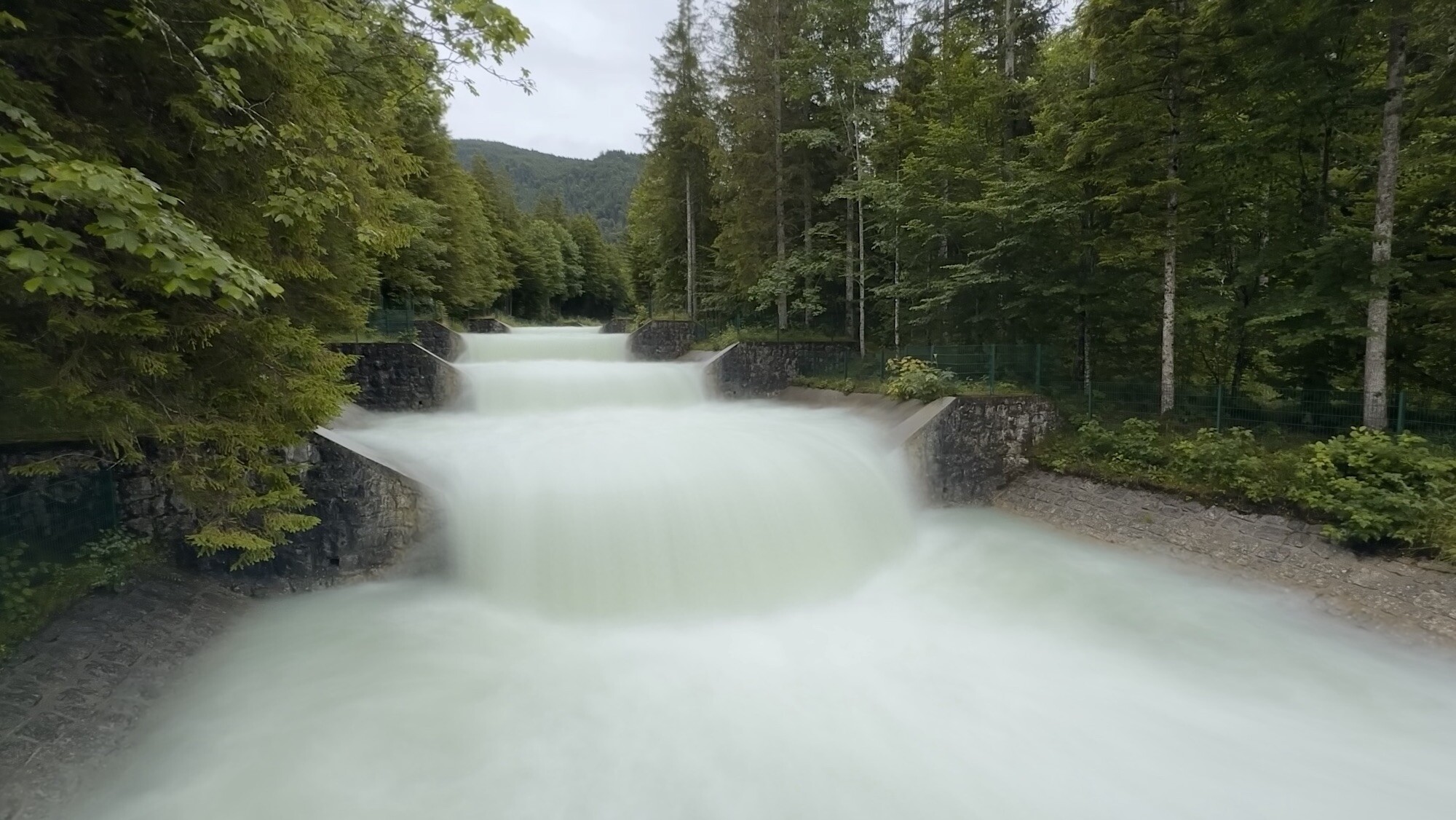 Aan het einde van het meer komt de rivier met grof geweld naar binnen stromen. Waar komt al dat water toch vandaan en zal dat wel zo blijven met die klimaat verandering. Het wordt vast anders maar nu nog even niet. Er wordt hier stroom opgewekt en de fotograaf in spé maakt een mooie tijdopname van de rivier