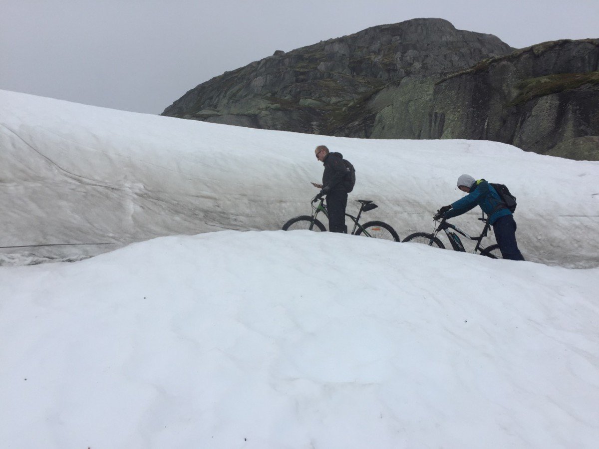 Bij de fietsverhuur werd ons al verteld dat er op delen van de route nog sneeuw lag. Wij fietsten op 7 juli dus de route is waarschijnlijk alleen aan het eind van de zomer sneeuwvrij. Tussen Finse en Hallingskeid (21 km) lag er nog op zeker 40 plekken sneeuw. Daar moesten we dus van de fiets af. Waterdichte schoenen zijn daarom aan te bevelen! Totaal hebben we over een lengte van 5 km door de sneeuw gelopen. Dat is best wel zwaar maar je krijgt er ook iets voor terug: een een waanzinnig mooie tocht door ongerepte natuur. Laat je dus niet afschrikken.