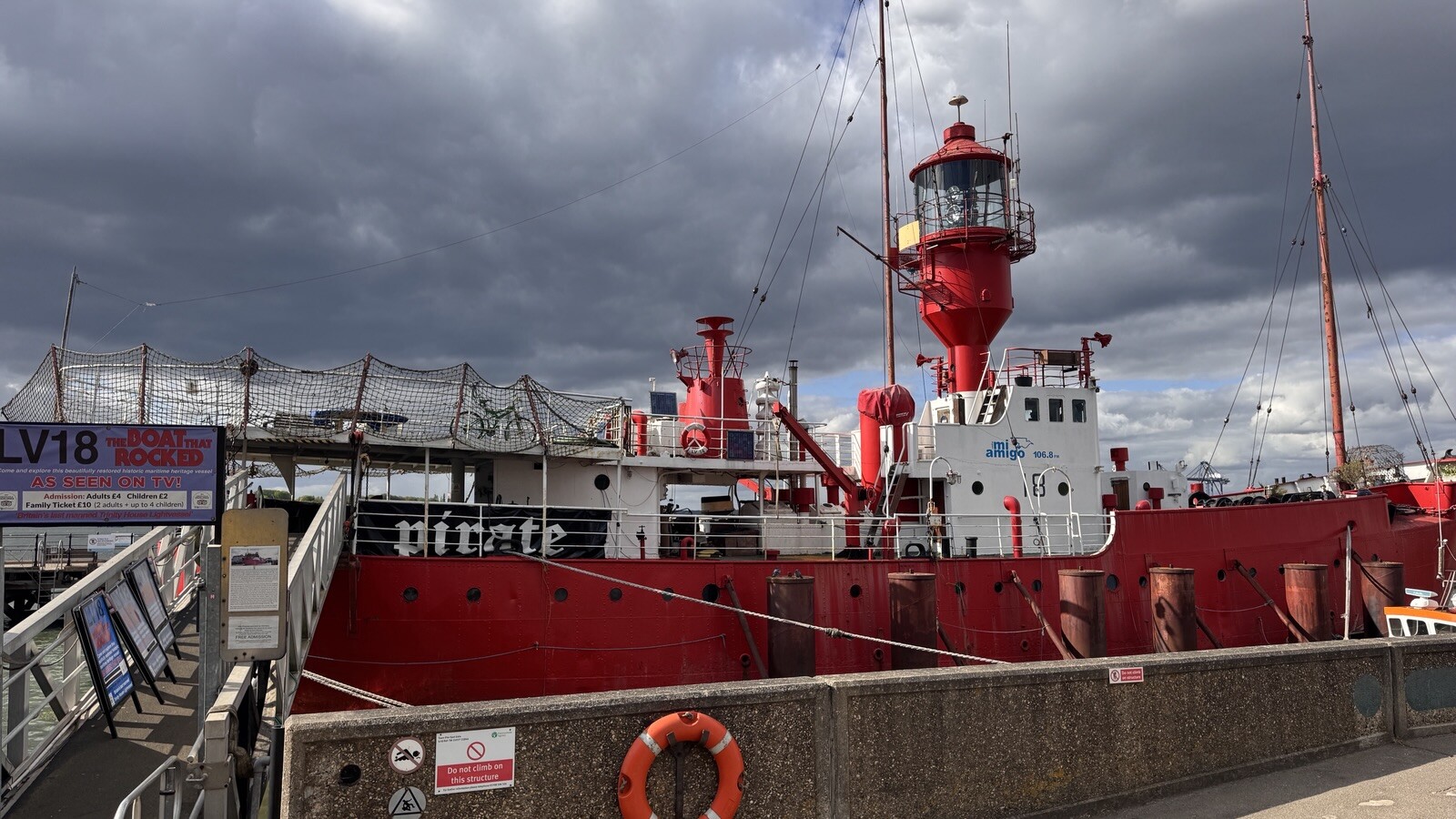 We eten dus een hamburgertje, fietsen weer terug en rijden tenslotte naar Harwich. Daar rijden we niet direct naar de boot maar naar de kop van de haven. Dat is best leuk als je moet wachten op de boot.
