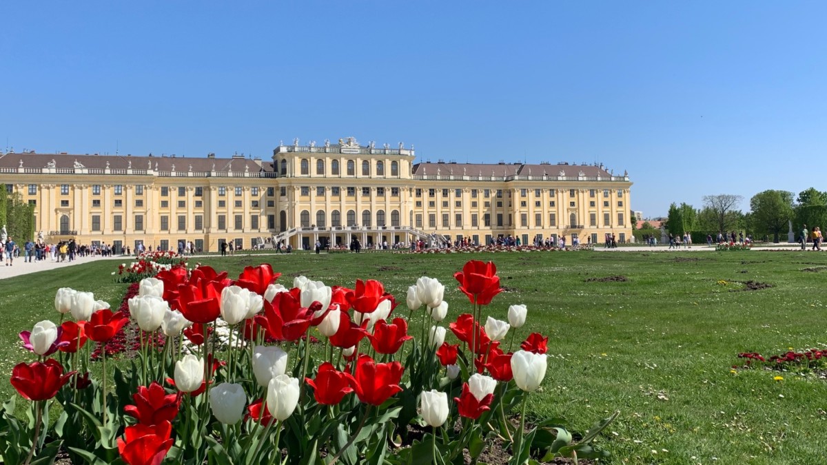 Laten we stellen dat de combinatie tweede paasdag, Schloss Schönbrunn en 24 graden niet de ideale combinatie is voor een bezoek. Wat een menigte. Ik schreef al eerder over al die toeristen op bekende locaties. Daar doen we natuurlijk zelf net zo hard aan mee maar het is bijna niet meer te doen. Ook hier wemelt het van de toeristen. Kaartjes voor het museum vergen een wachtrijtje voor de kassa van 45 minuten ! Nee dus. Goud, glitter en pracht kun je overal in Wenen vinden. We wandelen dus langs het paleis en brengen een bezoek aan de paleistuinen waar geen kaartje voor nodig is. Vanuit de tuinen heb je een mooi uitzicht op de achterzijde.