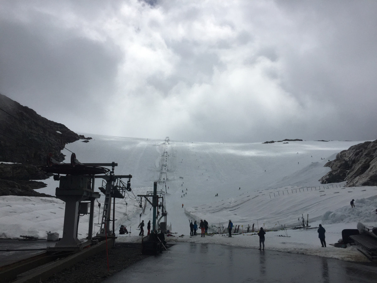 We hebben geslapen op de parkeerplaats van de Gletsjer. Om 08:00 worden we gewekt door personeel en skiërs die vroeg willen starten. Het is bewolkt en helaas regent het af en toe. We ontbijten, trekken onze skispullen aan en kunnen dan beginnen aan een dagje zomerskien